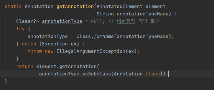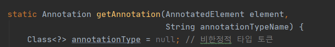 - 이 메서드는 토큰으로 명시한 타입의 애너테이션이 대상 요소에 달려 있다면 그 애너테이션을 반환하고, 없다면 nul을 반환한다.