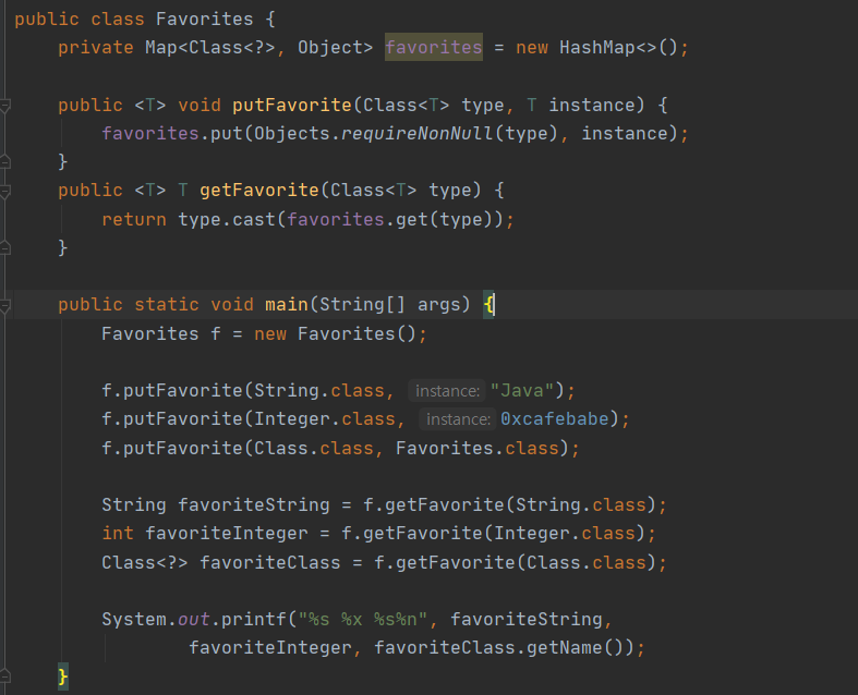 - 간단한 예로 타입별로 즐겨 찾는 인스턴스를 저장하고 검색할 수 있는 Favorites 클래스를 생각해보자.