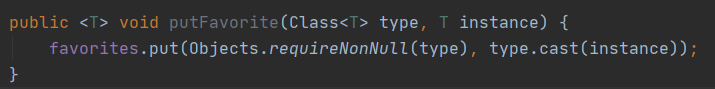 - Favorites가 타입 불변식을 어기는 일이 없도록 보장하려면 putFavorite 메서드에서 인수로 주어진 instance의 타입이 type으로 명시한 타입과 같은지 확인하면 되며 다음 코드와 같이 동적 형변환을 쓰면 된다.