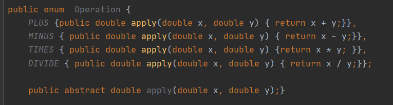 - 사칙연산 계산기의 연산 종류를 열거 타입으로 선언하고, 실제 연산까지 열거 타입 상수가 직접 수행한다고 해보자.