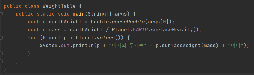 - 어떤 객체의 지구에서의 무게를 입력받아 여덟 행성에서의 무게를 출력하는 일을 다음처럼 짧은 코드로 작성할 수 있다.