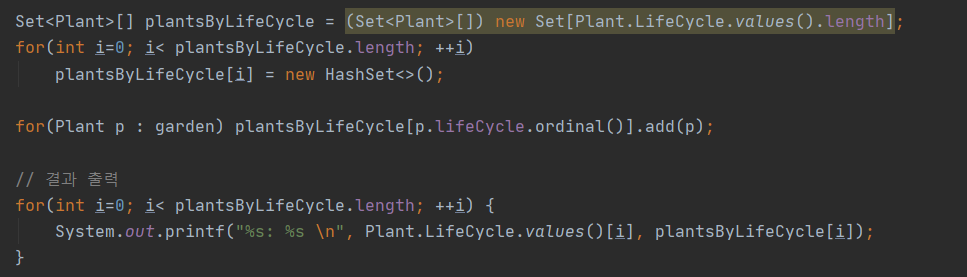 - 생애주기별로 총 3개의 집합을 만들고 정원을 한 바퀴 돌며 각 식물을 해당 집합에 넣는다.