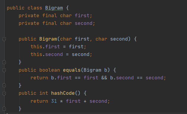 - 이 클래스는 바이그램, 즉 여기서는 영어 알파벳 2개로 구성된 문자열을 표현한다.