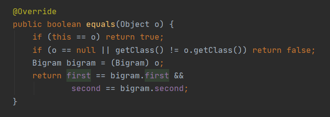 - 결과적으로 Obejct의 equals를 사용해 같은 소문자를 보유한 바이그램 10개 각각이 서로 다른 객체로 인식된다.