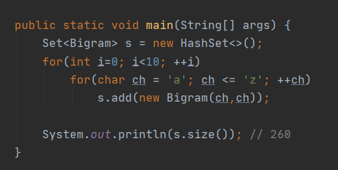 - main 메서드를 보면 똑같은 소문자 2개로 구성된 바이그램 26개를 10번 반복해 집합에 추가한 다음, 그 집합의 크기를 출력한다.