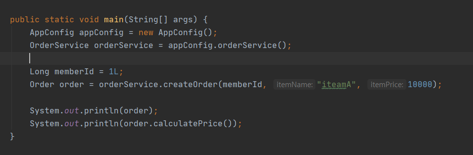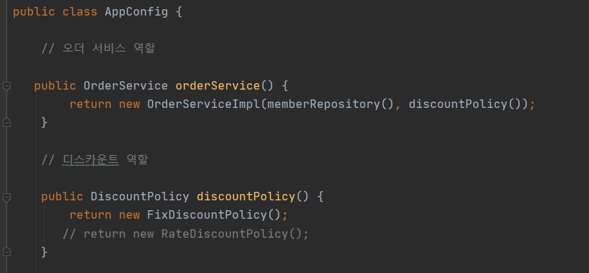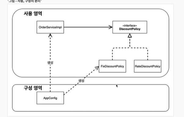 SRP : 지금 OrderServiceImpl 클래스는 구현 객체를 생성하고 실행하는 다양한 책임을 가진다.>> 구현 객체를 생성하고 연결하는 책임은 AppConfig가 담당해서 실행하는 책임만 담당하도록 함.