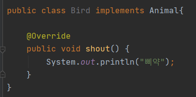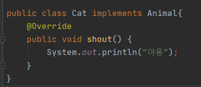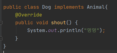 - 같은 지시 : 동일한 함수 시그내처 shout() 호출