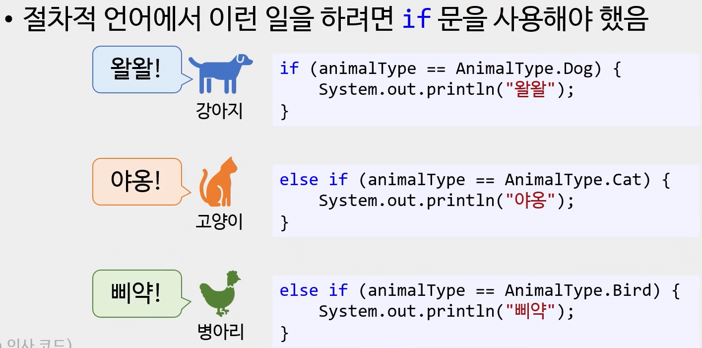 - 달리 동작 : 객체의 종류에 따라 실제로 실행되는 함수 구현의 코드가 달라진다.