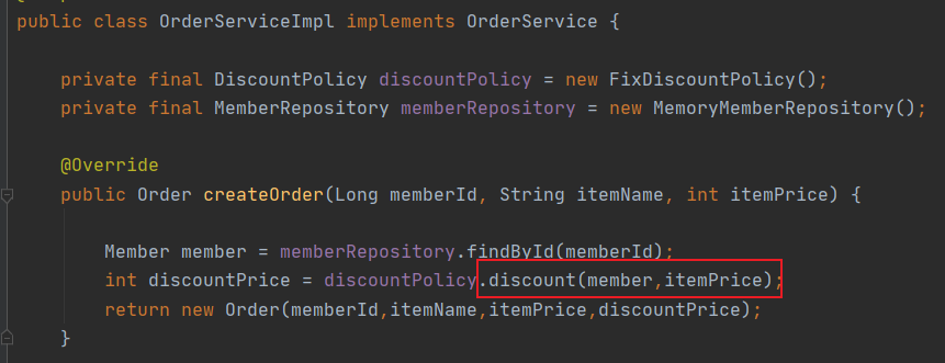 - OrderServiceImpl이 DiscountPolicy의 인터페이스에 정의된 distcount 메세지를 전송하고 있다.