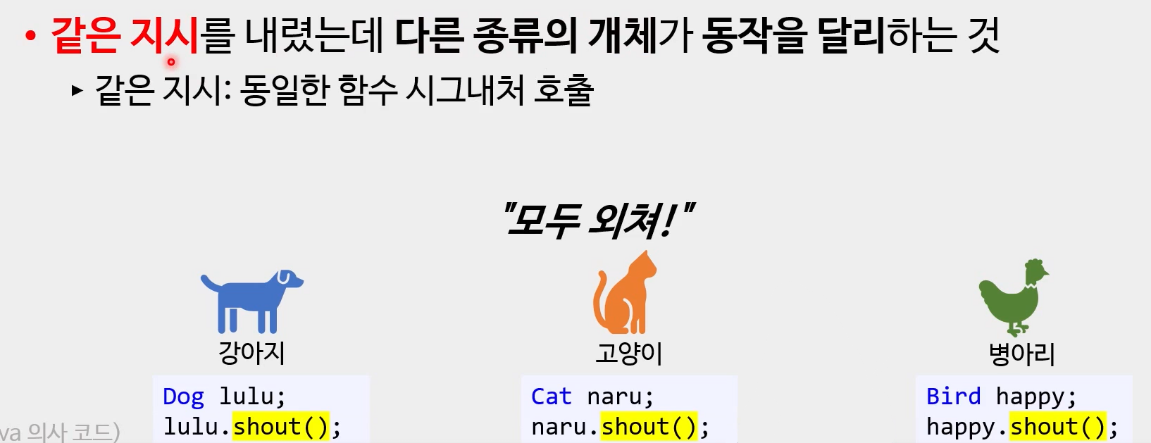 - 같은 지시를 내렸는데 다른 종류의 객체가 동작을 달리하는 것.