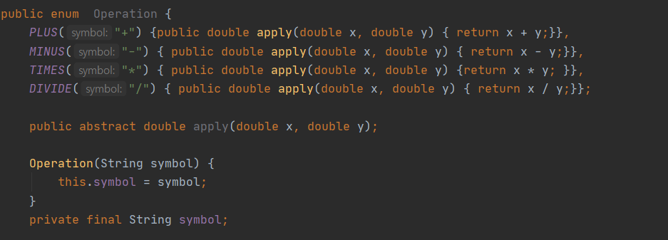 - 아이템 34의 Operation 열거 타입을 예로 apply 메서드의 동작이 상수마다 달라서 각 상수에서 apply 메서드를 재정의 했었다.