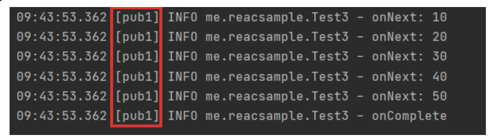 1234567...09:14:39.104 [pub1-2] INFO reactor.Flux.SubscribeOn.1 - onNext(10)09:14:39.104 [pub1-2] INFO reactor.Flux.SubscribeOn.1 - onNext(20)09:14:39.104 [pub1-2] INFO reactor.Flux.SubscribeOn.1 - onNext(30)09:14:39.104 [pub1-2] INFO reactor.Flux.SubscribeOn.1 - onNext(40)09:14:39.104 [pub1-2] INFO reactor.Flux.SubscribeOn.1 - onNext(50)09:14:39.104 [pub1-2] INFO reactor.Flux.SubscribeOn.1 - onComplete()cs - 결과를 보면 "pub1"이라는 쓰레드에서 로그가 찍히게 된다.