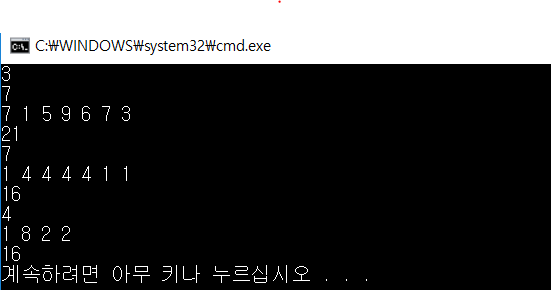 첫 줄에 테스트 케이스의 개수 C (C≤50)가 주어집니다. 각 테스트 케이스의 첫 줄에는 판자의 수 N (1≤N≤20000)이 주어집니다. 그 다음 줄에는 N개의 정수로 왼쪽부터 각 판자의 높이가 순서대로 주어집니다. 높이는 모두 10,000 이하의 음이 아닌 정수입니다.